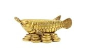 Used as a feng shui wealth enhancer, the Arowana symbol is depicted wearing coin-designed scales with a coin in its mouth and sitting on a bed of Chinese coins. It is said that having a symbol of this creature in the home, business or office brings all kinds of blessings. Examples: increased income, safety from accidents and harm, protection and guardianship, and the enhanced flow of chi (Chinese word for energy).
